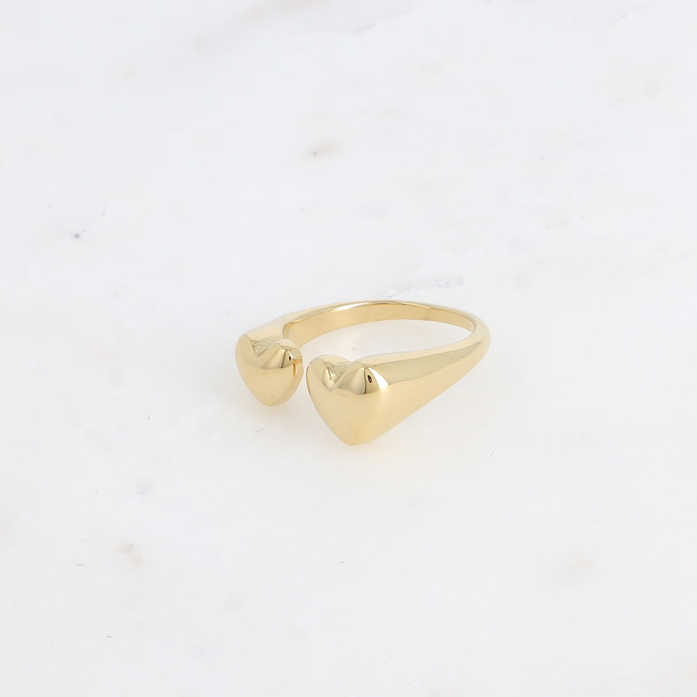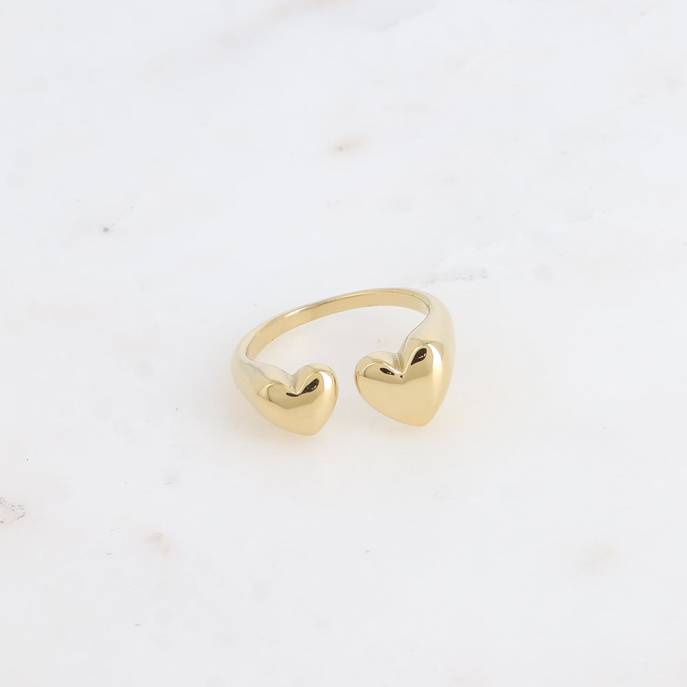 Bague ouverte en acier inoxydable composée de deux coeurs à chaque extrémité.
