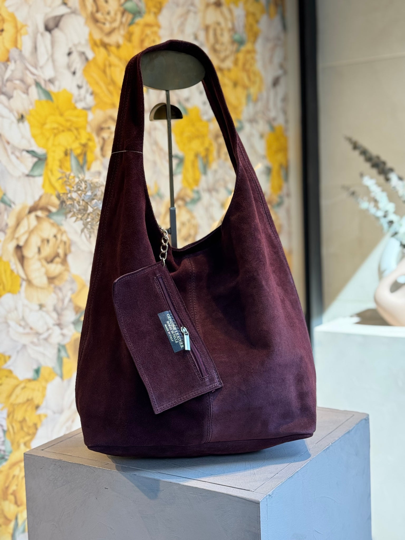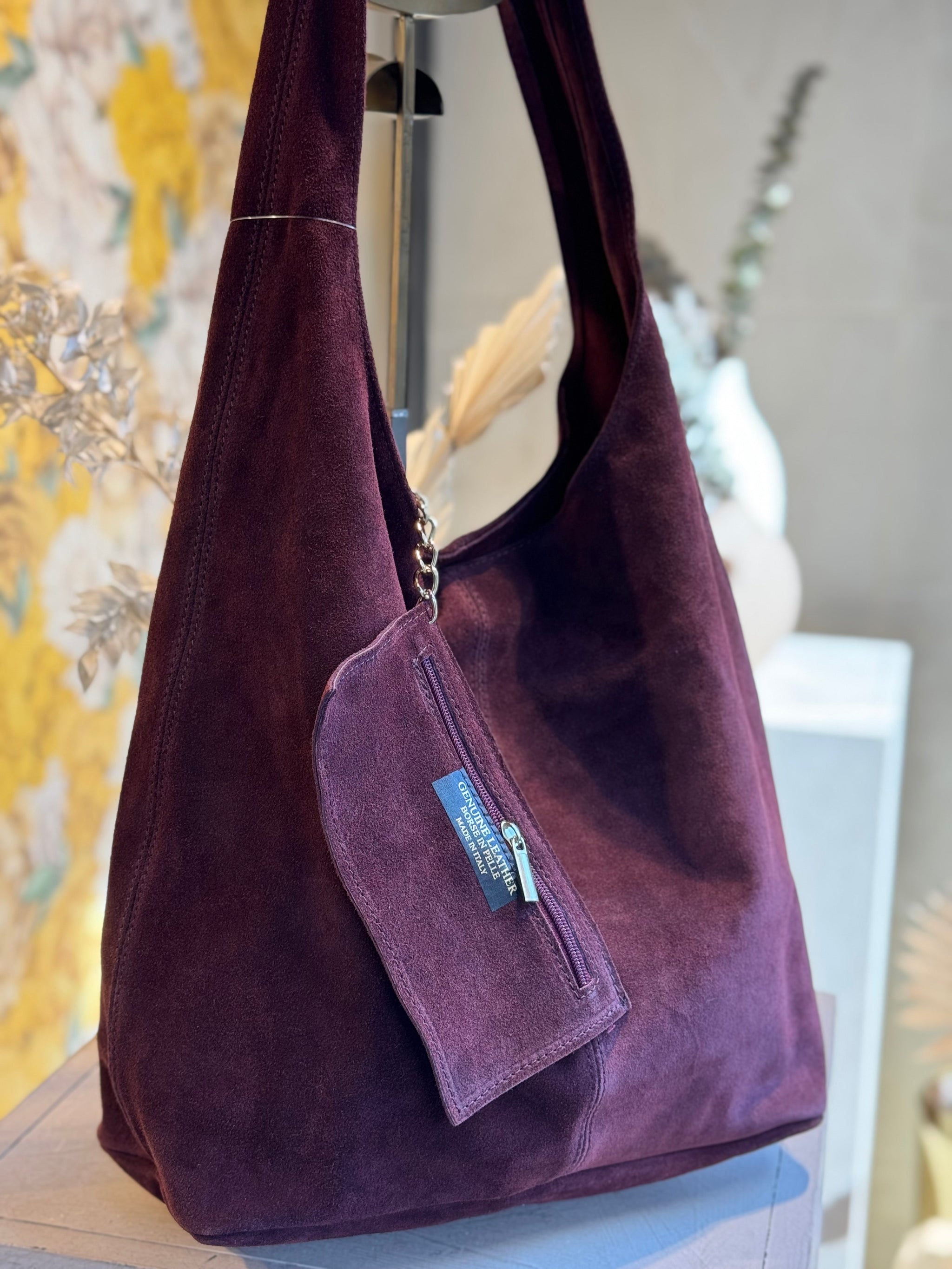 Sac en Cuir véritable, coloris lie de vin aspect CROUTE DE CUIR, fermeture éclair et anse sur l’épaule, dimensions : 33x32x17cm