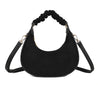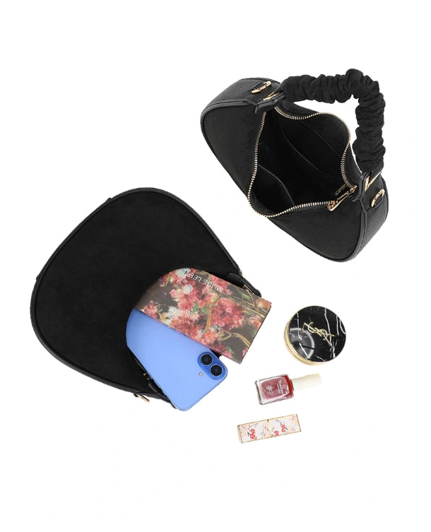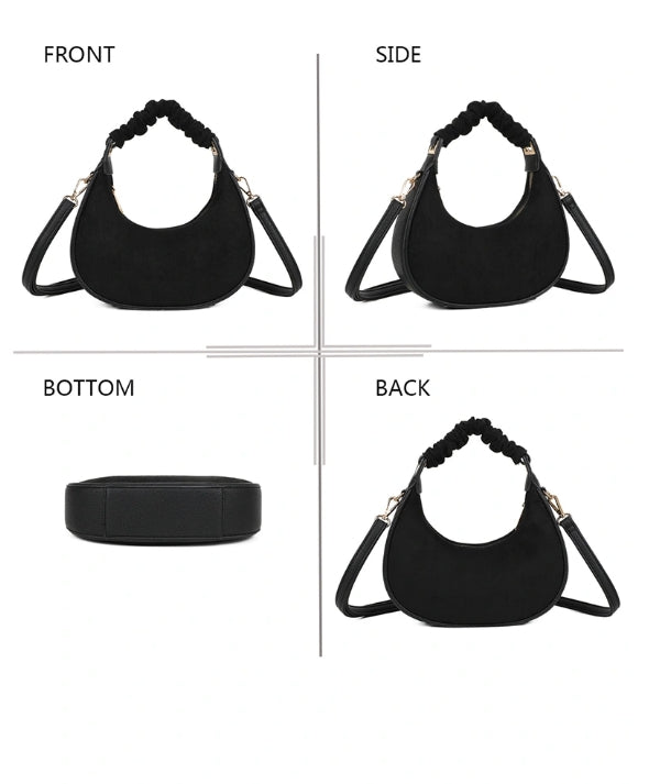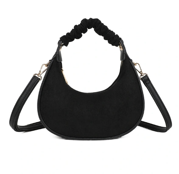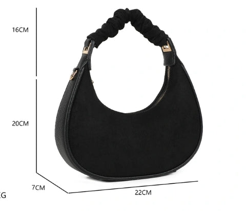 Sac noir format demi lune anse froncée et bandoulière, touché velours, un modèle tendance et chic, qui se marie avec toutes les couleurs. Dimensions : longueur 22cm x hauteur 20cm + 16cm à partir de la fermeture éclair jusqu'à la anse.