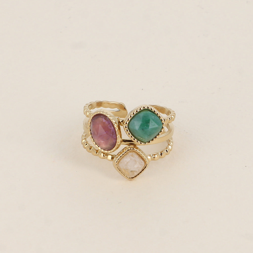 Bague en acier inoxydable composée de 3 anneaux effet milgrain et de 3 pierres naturelles carrées et ovale identiques à la photo.
