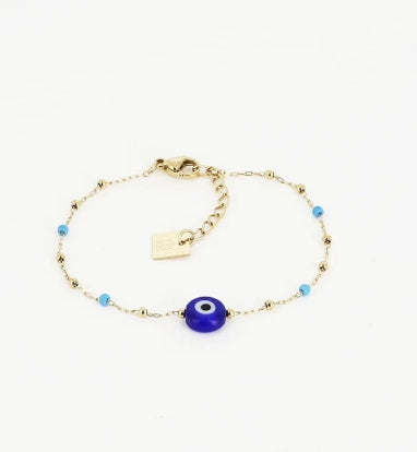 Bracelet en acier doré avec des petites billes agrémentés d'un oeil de verre bleu protecteur.