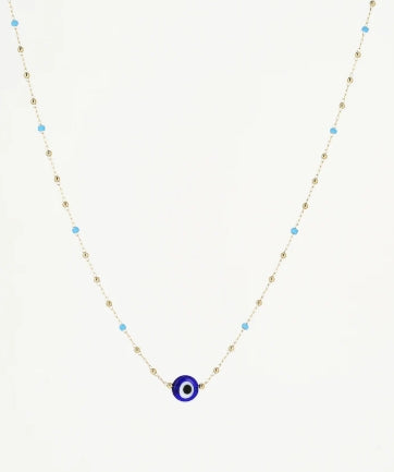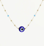 Collier en acier doré avec des petites billes agrémenté d'un oeil en verre bleu protecteur.