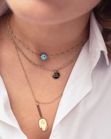 Ce motif est un talisman protecteur qui protège des mauvaises énergies. Longueur 38cm + 5cm de rallonge. Livré dans son pochon et sac de la marque zag bijoux.