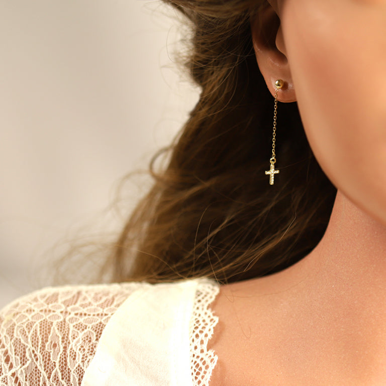 Boucles d'oreilles fils, au bout une croix est sertie d'oxydes de zirconiums. Disponible également en Argent925. Cette pièce originale est en plaqué or. Garantie 1 an. Ne craint pas l'eau. Livré dans son pochon et sac.