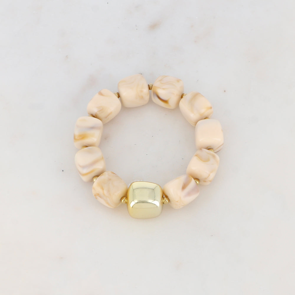Bracelet élastique orné de perles en résine et d'une perle métallique.