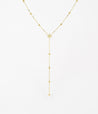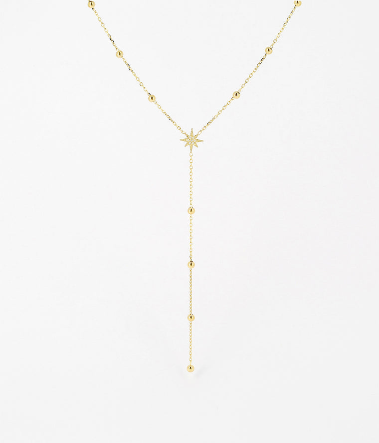 Collier en Y modèle ISAAC en acier doré à l'or fin par ionisation sur lequel sont disposées des petites billes, agrémenté au centre d'une étoile du nord à strass ou est attachée une chaînette suspendue pour l'effet de collier en Y. Longueur : 46cm + 5cm de rallonge.