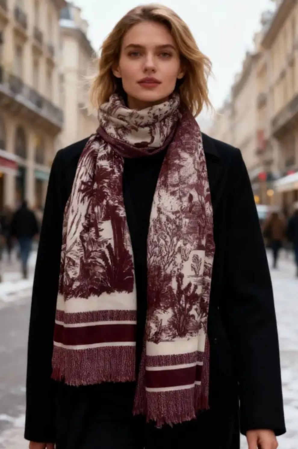 Foulard écharpe doux, 20% laine et 80% viscose, motif bordeaux sur fond écru.
