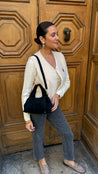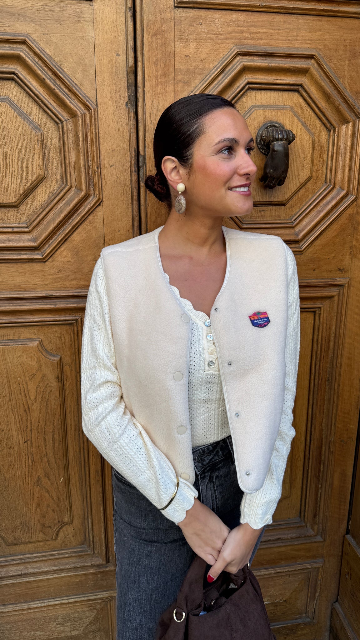 Gilet bouclette uni avec logo, taille unique convient du 36 au 42, fermeture pression.